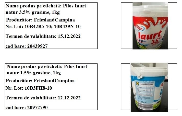Potrivit alertei emise de ANSVSA și Lidl, alerta vizează următoarele produse:- Pilos Iaurt natur 3.5% grăsime, 1kg, cu termen de valabilitate 15.12.2022 și cod de bare 20439927- Pilos Iaurt natur 1.5% grăsime, 1kg, cu termen de valabilitate 12.12.2022 și cod de bare 20972790.