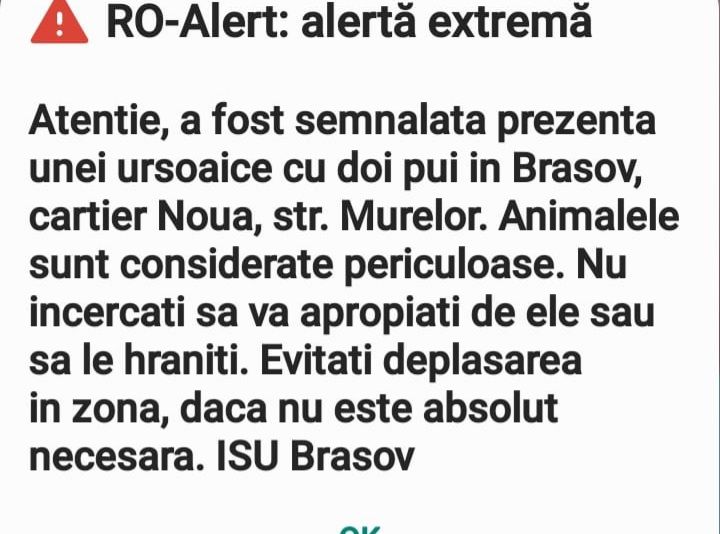 Inspectoratul pentru Situații de Urgență a trimis, în această seară, un mesaj RO-ALERT prin care este semnalată prezența unui urs în municipiul Braşov!
