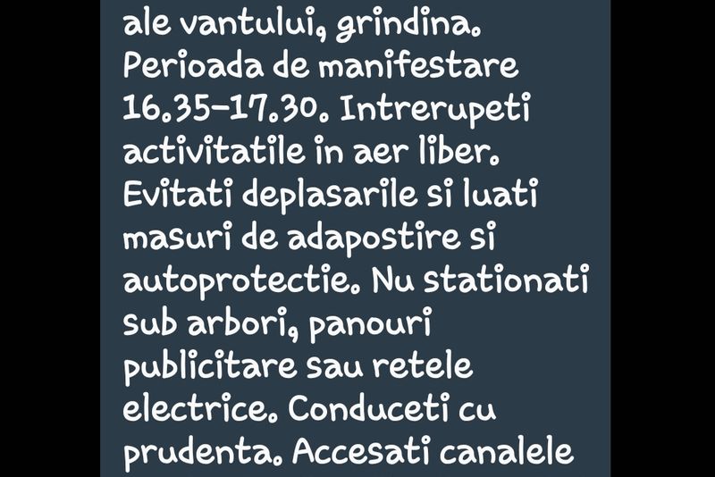 Inspectoratul pentru Situații de Urgență Braşov a trimis un mesaj Ro-Alert prin care anunță populația să se ferească de vremea severă din această după-amiază.