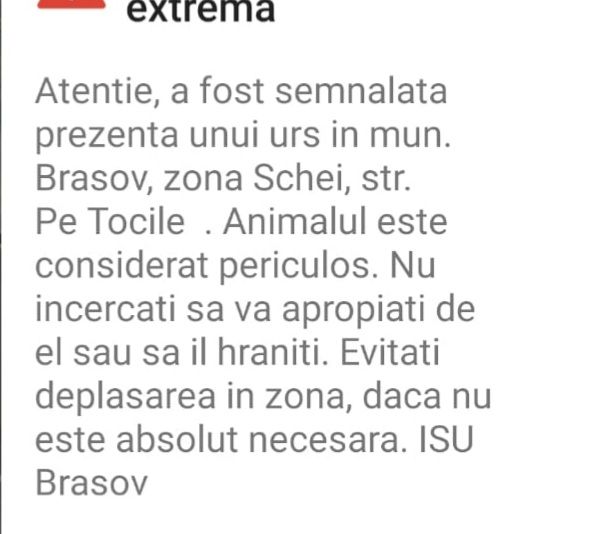 Inspectoratul pentru Situații de Urgență a trimis un mesaj Ro Alert care anunță prezența unui urs în municipiul Braşov, în cartierul Schei.