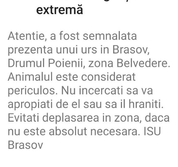 Inspectoratul pentru Situații de Urgență Brașov a trimis, în această dimineață, un mesaj RO-ALERT prin care este semnalată prezența unui urs pe Drumul Poienii.