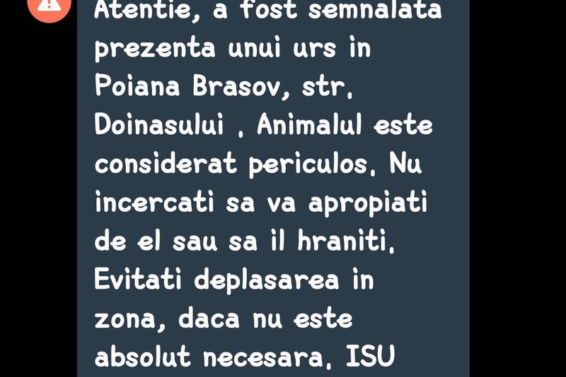 Inspectoratul pentru Situații de Urgență Braşov a trimis, acum câteva minute, un mesaj RO-ALERT prin care este semnalată prezența unui urs în Poiana Braşov.