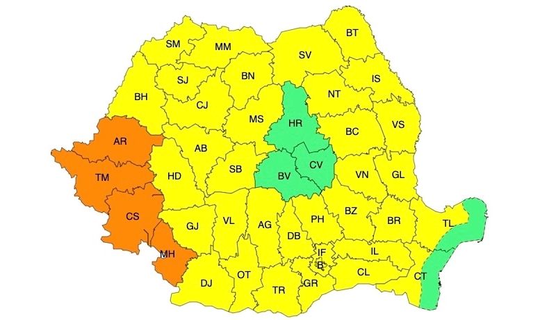 În județele Arad, Timiș, Caraș-Severin și Mehedinți canicula se va intensifica, disconfortul termic va fi accentuat, iar indicele temperatură-umezeală (ITU) va atinge pragul critic de 80 de unități. Temperaturile maxime, deosebit de ridicate pentru această dată, vor fi de 35...37 de grade, iar minimele de 18...20 de grade, valori ușor mai mari, în jurul a 23 de grade, urmând a se înregistra în Dealurile de Vest.