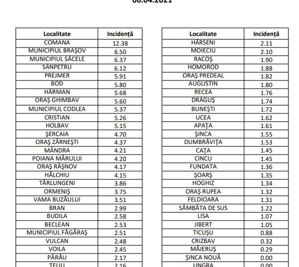 În municipiul Brașov avem o rată de infectare de 6,50 la mia de locuitori. În Comăna, incidența a ajuns la 12,38 la mia de locuitori. Prefectului județului Brașov, Mihai Cătălin Văsii, a convocat în această dimineață o ședință în format restrâns pentru discutarea situației epidemiologice din comuna Comana. Au participat subprefecții Izabella Agnes Ambrus și Codruț Bucur, directorul executiv al DSP Brașov, dr. Andrea Neculau, șeful Inspectoratului de Poliție Județean, chestor de Poliție Valentin Flucuș, inspectorul-șef al ISU Brașov, col. Lucian Marciu, prim-adjunctul inspectorului-șef al Inspectoratului de Jandarmi Județean, lt. col. Gheorghiță Stelian Trotuș, și adjunctul comandantului Grupării Mobile de Jandarmi Brașov, lt. col. Constantin Lobodan.