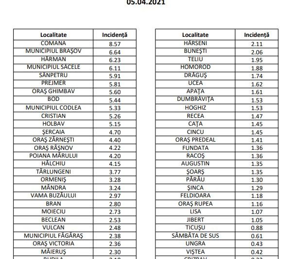 Și în municipiul Brașov avem parte de o incidență în scădere, de la 6,78, la 6,64 la mia de locuitori. Incidența a crescut alarmant la Comăna, de la 7,62, la 8,57. Rată de infectare peste 6 mai avem la Hărman (6,23) și Săcele (6,11).