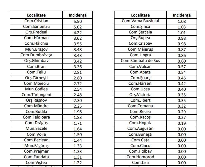 Și în municipiul Brașov rata de infectare este în scădere, de la 3,54 la mia de locuitori ieri, la 3,48 astăzi. Situația completă pe localități, mai jos: