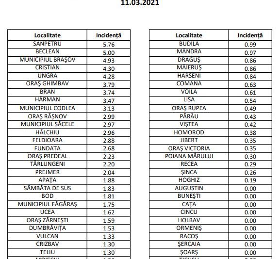 Și în municipiul Brașov avem parte de o creștere alarmantă a incidenței, de la 4,61 ieri, la 4,93 astăzi. Beclean (5) și Sânpetru (5,76) sunt localitățile cu cea mai ridicată rată de infectare din județ. 9 localități au incidența peste 3 la mia de locuitori.