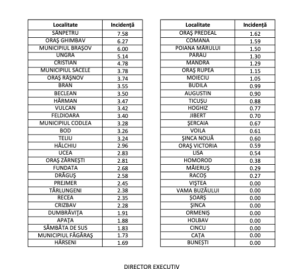 Direcția de Sănătate Publică Braşov a anunțat rata de infectare cu noul coronavirus din județ.