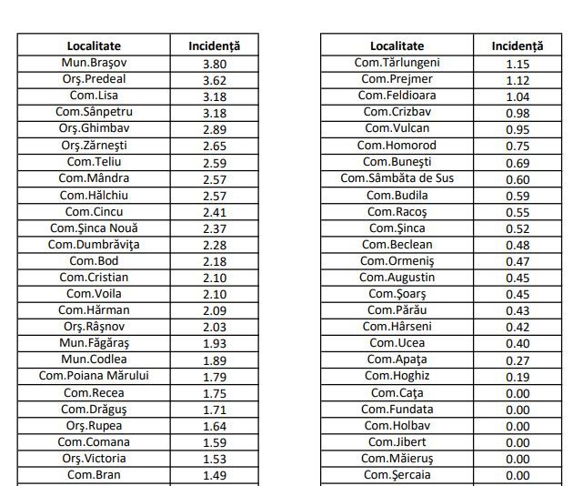 Direcția de Sănătate Publică Brașov a anunțat incidența cazurilor de SARS-COV-2 din localitățile județului.