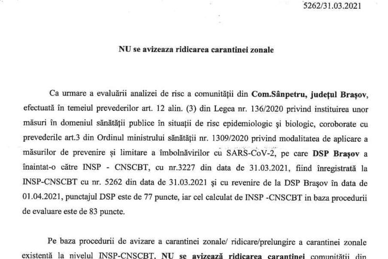 În documentul din 31 martie trimis de Institutul Național de Sănătate Publică se precizează că NU se avizează ieșirea din carantină a localității Sânpetru, care, astăzi, a înregistrat o incidență de 6,63 la mia de locuitori. Prefectura Brașov a anunțat că în urma avizului negativ, Comitetul Județean pentru Situații de Urgență Brașov va propune prelungirea cu 7 zile a carantinei zonale la Sânpetru.