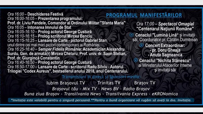 Spectacolul omagial va fi sărbătorit la Brașov printr-o serie de evenimente deosebite, toate dedicate celor 100 de ani de la Marea Unire. Potrivit www.brasovtv.com, oameni marcanți de cultură din Transilvania vor susține diverse momente artistice. Cei prezenți vor avea parte de prologuri, concerte inedite, lansări de carte, spectacole omagiale și multe alte surprize. Spectacolul va avea loc la Centrul Cultural Reduta, iar intrarea este liberă, în limita locurilor disponibile.