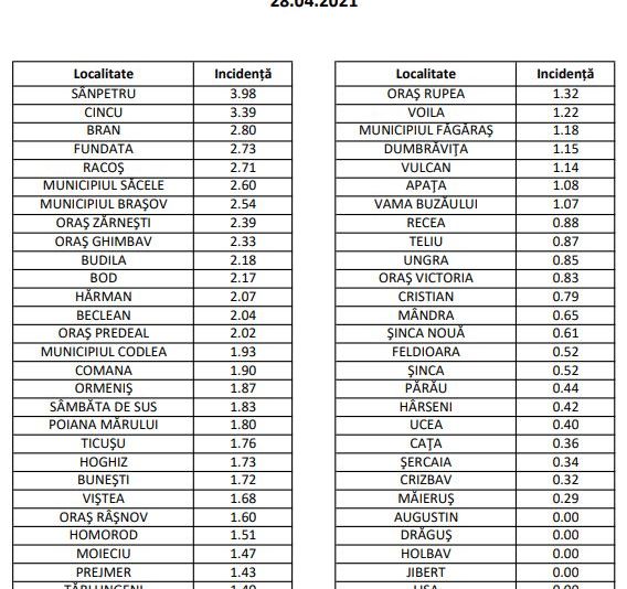 Evoluția incidenței SARS-COV-2 din localitățile județului Brașov