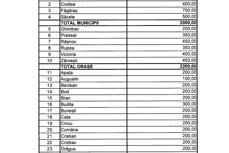 Este vorba, în total, de 14,3 milioane de lei, bani care au fost acordați, în funcție de nevoi, localităților din județul Brașov, pentru susținerea programelor de dezvoltare locală și a proiectelor de infrastructură, ce necesită cofinanțare locală.[embed]https://youtu.be/bTddYj7Qcbw[/embed]Orașele și municipiile au primit, în total, peste 4 milioane de lei. Pe primul loc este Făgărașul, cu mai bine de 700.000 de lei. La polul opus se află Augustinul, cu doar 100.000 de lei.