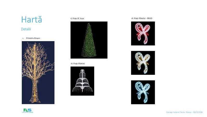 ,,Pe strada Republicii vor fi 27 de portaluri care duc spre locul central al Braşovului istoric. În Piaţa Sfatului, pe lângă brad şi Târgul de Crăciun, în zona fântânii arteziene, va fi amplasată o fântână luminoasă, iar în Piaţa Sf. Ioan va fi amplasat un brad de Crăciun din luminiţe cu înălţimea de 10 m. Şi zona pietonală nou-creată în zona clădirii primăriei, la intrarea dinspre N. Iorga, va deveni mai luminată, prin amplasarea unui copac de lumini, de 4 metri înălţime. Doi îngeraşi luminoşi de 3 metri vor fi amplasaţi în Parcul Titulescu.
