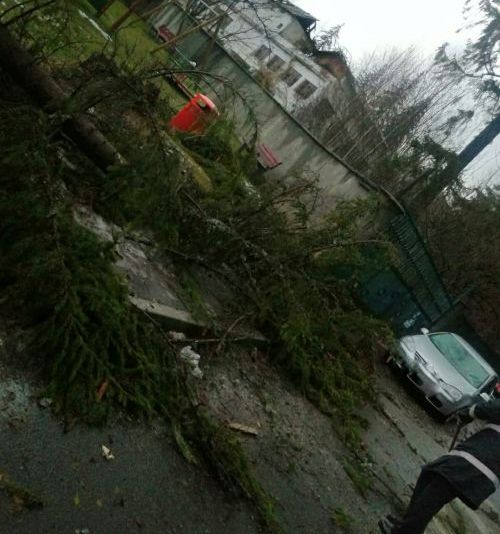 ISU Brașov anunță că, din cauza vântului puternic, un copac a căzut peste un autoturism, în Poiana Brașov.