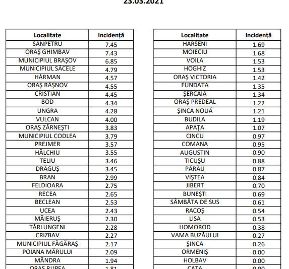 Nu mai avem niciun loc la ATI, toate cele 28 fiind ocupate de săptămâni bune, iar în celelalte spitale COVID din municipiu și județ mai sunt paturi pentru tratarea pacienților (NU ATI), însă personal insuficient. Cu o nouă creștere a ratei de infectare, în ultimele 24 de ore, de la 6,67 la mia de locuitori, la 6,85, municipiul Brașov pare tot mai aproape de carantină. Situații delicate avem, în continuare și la Sânpetru (incidență 7,45, de la 7,57) și Ghimbav, acolo unde înregistrăm una dintre cele mai alarmante creșteri din ultimele 24 de ore: de la 6,91 la mia de locuitori, la 7,43.