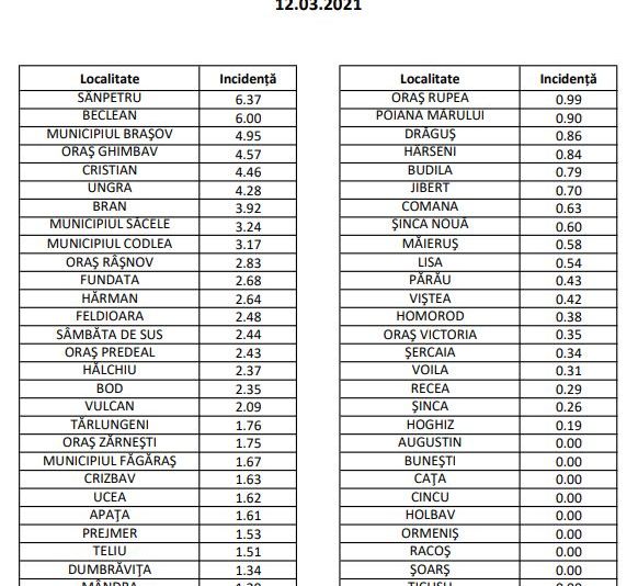 Și în municipiul Brașov avem o creștere, de la 4.93 la mia de locuitori ieri, la 4,95 astăzi. 6 localități au rata de infectare peste 4 la mia de locuitori.