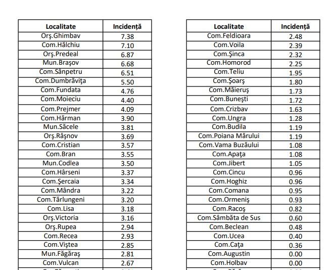 În municipiul Brașov avem o incidență de 6,68 la mia de locuitori, în creștere față de ziua precedentă, când a fost 6,57. Cea mai ridicată rată de infectare este, astăzi, la Ghimbav, de 7,38 la mia de locuitori.