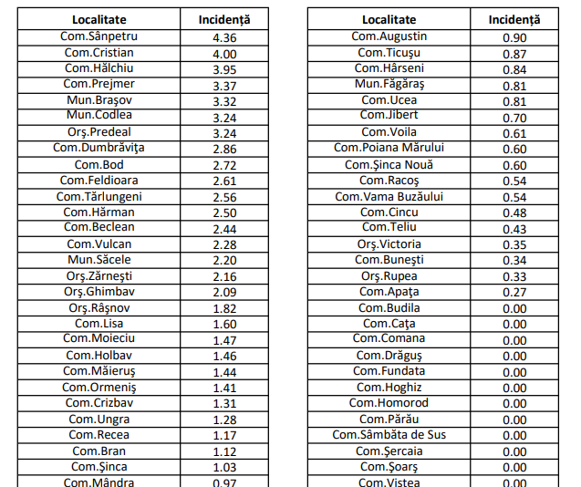 În municipiul Braşov avem exact aceeaşi incidență a cazurilor de coronavirus ca acum 24 de ore, adică 3,32 la mia de locuitori. 7 localităţi din judeţ au rata de infectare peste 3 la mia de locuitori. La nivelul judeţului, incidența SARS-COV-2 este în creştere, de la 2,38, la 2,46.