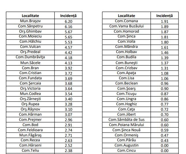 O rată de infectare în scădere avem și în municipiul Brașov, de 6,20 astăzi, față de 6,53 ieri.