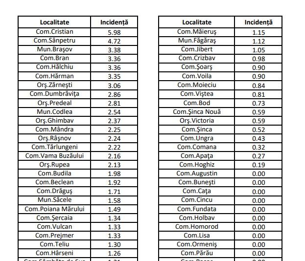 La nivelul județului Brașov, incidența cumulată, în ultimele 14 zile, este de 2,51 la mia de locuitori, în scădere față de ieri, când a fost 2,7. În municipiul Brașov avem o rată de infectare tot în scădere, de la 3,66 la mia de locuitori ieri, la 3,38 astăzi.