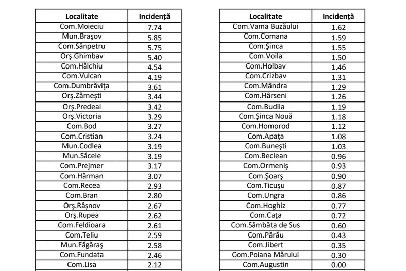 Incidența SARS-COV-2 din localitățile județului Braşov!