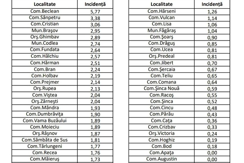 Direcția de Sănătate Publică Braşov a anunțat rata de infectare cu noul coronavirus.