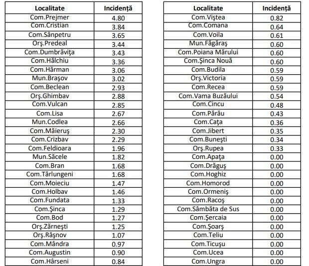 Direcția de Sănătate Publică a anunțat ratat de infectare cu SARS-COV-2 din localitățile județului Brașov.