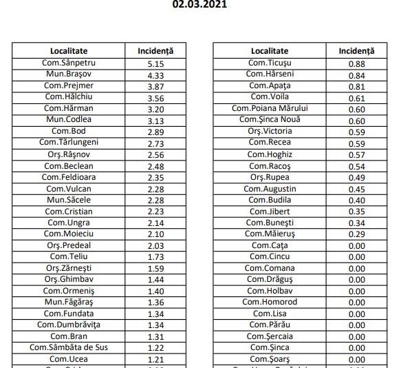 Și în municipiul Brașov avem o rată de infectare în creștere, în ultimele 24 de ore, de la 4,16 la mia de locuitori, la 4,33. 6 localități au incidența peste 3 la mia de locuitori. Situația completă, mai jos: