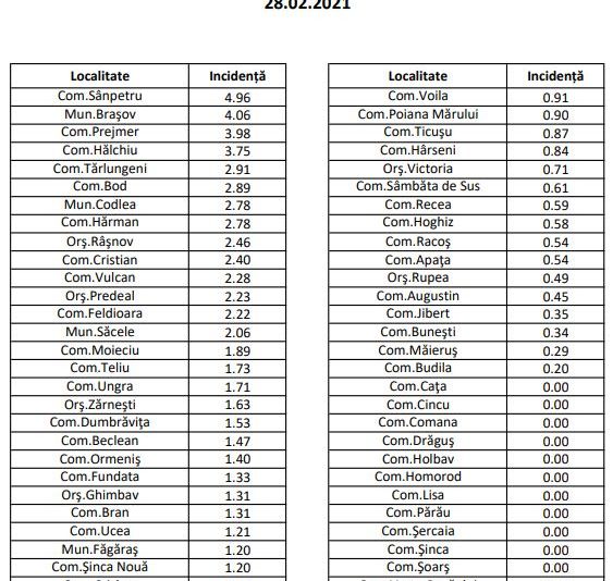 O scădere avem și în municipiul Brașov în ultimele 24 de ore, de la 4,17 la mia de locuitori, la 4,06. Pe lângă municipiul Brașov, alte 3 localități mai au incidența peste 3 la mia de locuitori: Sânpetru (4,96), Prejmer (3,98) și Hălchiu (3,75). Situația completă, mai jos: