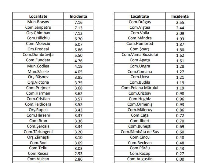 Direcția de Sănătate Publică Brașov a anunțat incidența cazurilor de coronavirus din localitățile județului Brașov.