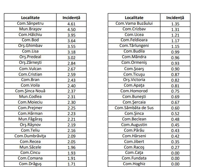 Potrivit informațiilor furnizate de Direcția de Sănătate Publică, incidența cazurilor de COVID-19, în județul Brașov este 3,11, la mia de locuitori, fără focare.