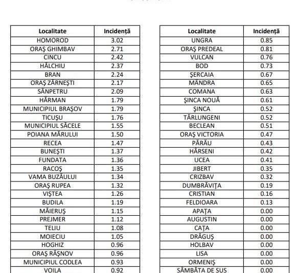 Incidența SARS-COV-2 din localitățile județului Brașov