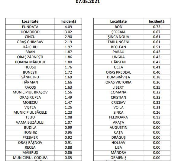 Incidența SARS-COV-2 din localitățile județului Brașov