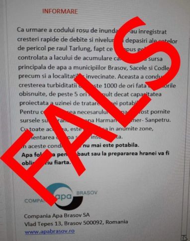 Apa furnizată de noi în toate localitățile deservite este potabilă. Chiar dacă a plouat în ultima săptămână, acest fapt nu a afectat în niciun fel calitatea apei. Vă asigurăm, din nou, în mod oficial, că mesajele care circulă pe rețelele de socializare nu au nicio acoperire. Dezinformările de acest tip au devenit un obicei, la fiecare ploaie mai puternică. Reamintim, pentru a obține informații corecte și oficiale, sunați la 0268926, intrați pe pagina oficială de Facebook sau pe www.apabrasov.ro - se arată într-un comunicat al Companiei APA Brașov.