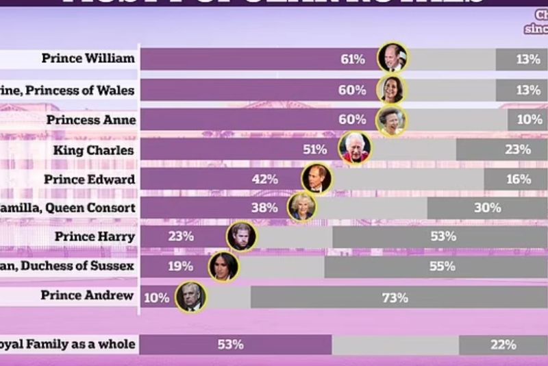 Prințul William. Moștenitorul tronului britanic este martorul celei mai bruște scăderi a popularității sale, cu 8 la sută într-o lună, din 22 decembrie 2022. Soția sa, Prințesa de Wales - Kate este la egalitate cu Prințul Harry, cu o pierdere de 7% în popularitate în rândul britanicilor. Și Meghan Markle a coborât în preferințele acestora.
