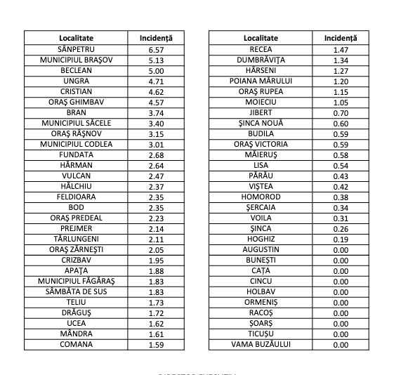 Astfel, la nivelul județului avem o rată de infectare de 3,52 la mia de locuitori, față de 3,37 ieri. Iar în municipiul Braşov, incidența a ajuns la 5,13 la mia de locuitori, de la 4,95. Situația este îngrijorătoare la Sânpetru şi Beclean.