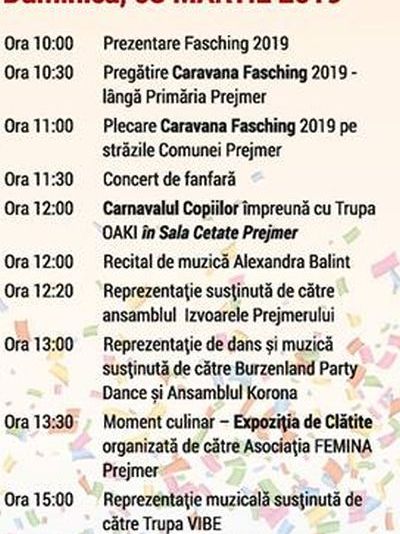 Reprezentanţii Primăriei Prejmer pun la dispoziţia doritorilor un autocar ce va face curse regulate Braşov – Prejmer şi retur, în zilele de 2 -3 martie 2019, când are loc Festivalul Clătitelor. Numărul maxim de persoane admise pe cursă este de 50. Transportul este GRATUIT. De la Braşov, autobuzul va pleca din Triaj, la orele: 9.00, 10.30, 12.00, 13.30, 15.00, 16.30, 18.00. Cursa retur, Prejmer (centru) - Braşov va avea următorul orar: 9.45, 11.15, 12.45, 14.15, 15.45, 17.15, 18.45.Invitata specială a zilei de ieri a fost Nicole Cherry, iar astăzi, Smiley va susține un concert, de la ora 16.00. Programul complet al zilei: