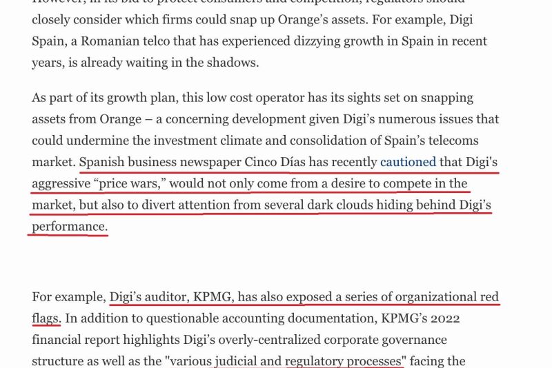 Într-o analiză extinsă publicată de Forbes.com, jurnaliștii acordă o atenție extinsă problemelor pe care compania DIGI le-ar avea în Spania și România. Jurnaliștii vorbesc despre intenția Digi de creștere în Spania, dar trag un semnal major de alarmă: "În încercarea sa de a proteja consumatorii și concurența, autoritățile de reglementare ar trebui să analizeze cu atenție. Ca parte a planului său de creștere, Digi, acest operator low-cost, ar putea submina climatul de investiții și consolidarea pieței spaniole de telecomunicații."Ziarul spaniol de afaceri Cinco Días a avertizat recent că "războiul agresiv al prețurilor" al Digi nu ar proveni doar din dorința de a concura pe piață, ci și pentru a distrage atenția de la mai mulți nori negri care se ascund în spatele performanței DIGI.De exemplu, auditorul DIGI, KPMG, a dezvăluit o serie de semnale de alarmă organizaționale. Pe lângă documentația contabilă îndoielnică, raportul financiar 2022 al KPMG subliniază structura de guvernanță corporativă excesiv de centralizată a Digi, precum și "diversele procese judiciare și de reglementare" cu care se confruntă compania, inclusiv o acuzație de corupție în România. În mod crucial, aceste defecte interne cultivă neîncrederea investitorilor într-un moment în care investițiile în rețele sunt extrem de necesare, ceea ce face ca potențiala achiziție a activelor Orange de către Digi să fie un risc de care piața spaniolă de telecomunicații trebuie să fie protejată.Jurnaliștii vorbesc despre posibilitatea ca Digi să fie interesat de cumpere anumite active ale Orange Spania în contextul în care autoritățile analizează deja o eventuală fuziune a doi giganți iberici: Orange-MasMóvil.Articolul subliniează faptul că, în eventualitatea în care Digi și-ar dori să investească mai mult în piața spaniolă, autoritățile ar trebui să fie extrem de atente, "având în vedere că blocul comunitar are nevoie de un impuls semnificativ în materie de investiții în rețelele 5G și în alte tehnologii de ultimă generație pentru a accelera tranziția digitală și ecologică".