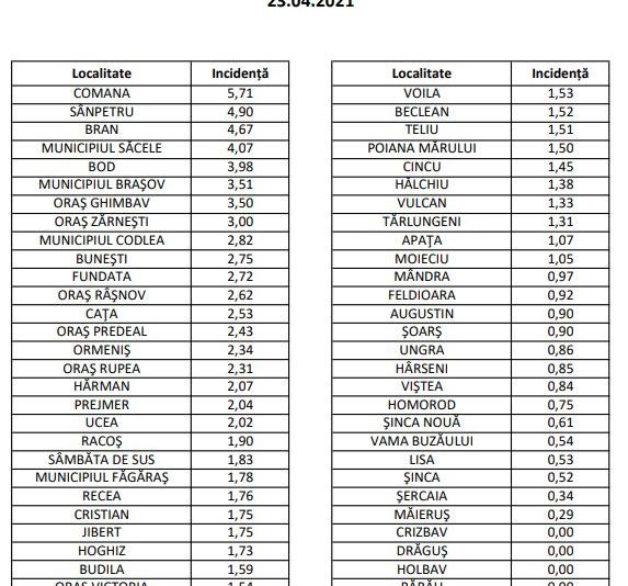 Direcția de Sănătate Publică Brașov a anunțat că incidența SARS-COV-2 din județul Brașov a scăzut, astăzi, până la 2,84 la mia de locuitori, de la 2,96. Și în municipiul Brașov avem o scădere, de la 3,64, la 3,51 la mia de locuitori.