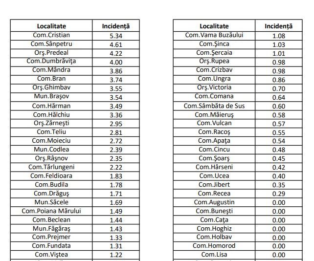 În municipiul Brașov, incidența este de 3.54 la mia de locuitori, față de 3.67 ieri. Situația completă pe localități, mai jos:
