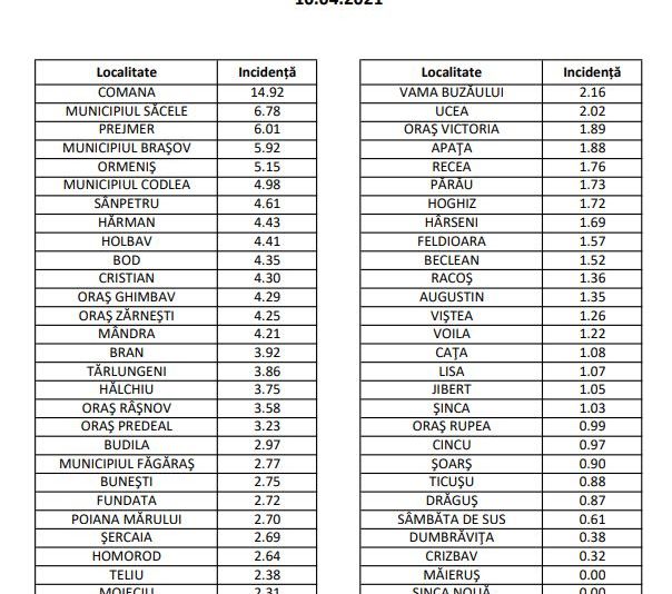 Rata de infectare SARS-COV-2 din localitățile județului