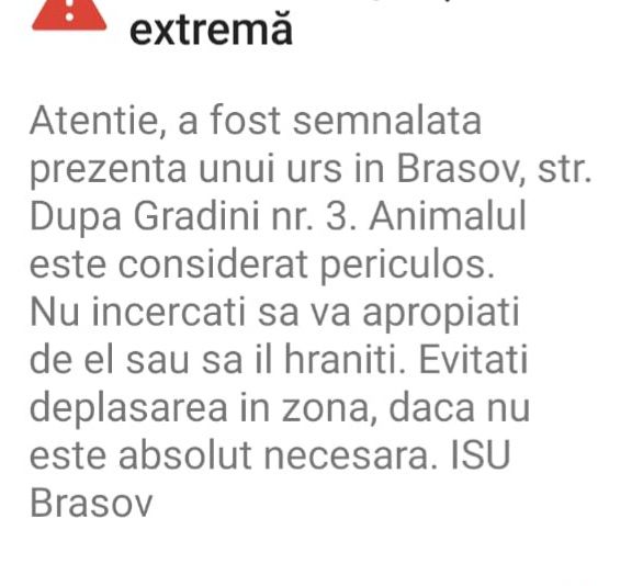 ISU Braşov a trimis un mesaj Ro Alert prin care este semnalată prezența unui urs în Şcheii Braşovului. Jandarmii intervin în zonă.