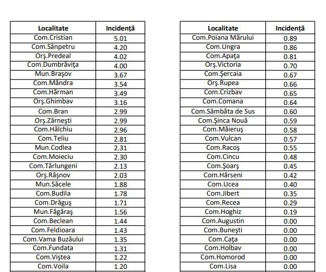 Direcția de Sănătate Publică Brașov a anunțat incidența cazurilor de infectare cu noul coronavirus din localitățile județului.