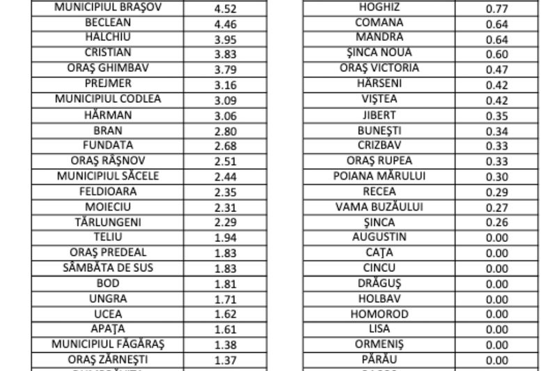 Şi în municipiul Braşov avem parte de o scădere în ultimele 24 de ore, de la 4,75 la mia de locuitori, la 4,52. 9 localități au incidența peste 3 la mia de locuitori.