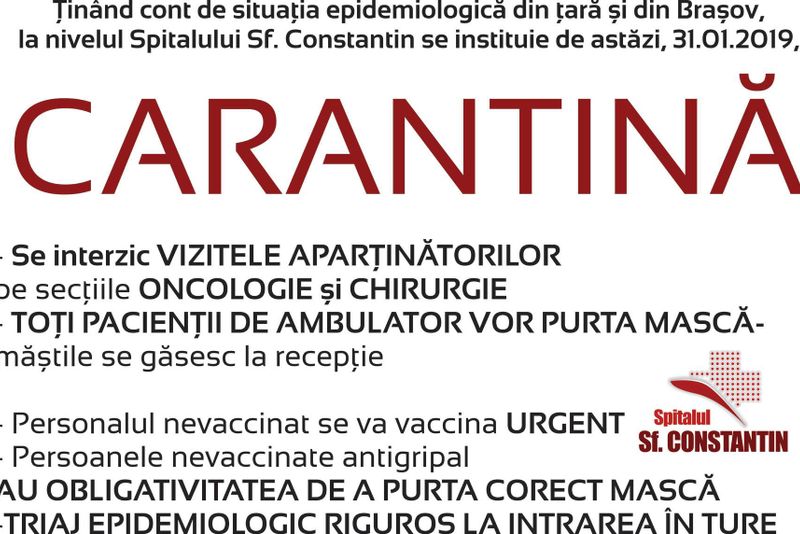 După ce, ieri, ministrul Sănătății a anunțat epidemie de gripă la nivel național, un spital din municipiul Brașov a intrat, astăzi, în carantină.