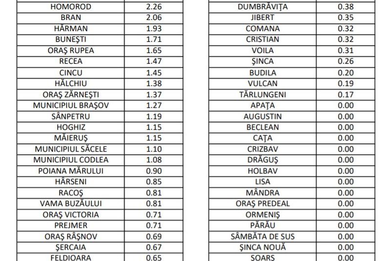 Direcția de Sănătate Publică a anunțat că rata de infectare din județul Brașov a scăzut la 1,03 la mia de locuitori. Nu avem nicio localitate cu incidență peste 3 la mia de locuitori. De asemenea, și în municipiul Brașov avem o incidență în scădere, care a ajuns la 1,27 la mia de locuitori.