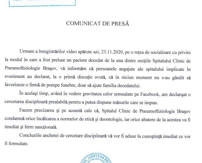 Scandal la Spitalul Stejeriș din municipiul Brașov, secția a Spitalului de Pneumoftiziologie. Prin mai multe postări pe Facebook, Roxana Petcu îi acuză pe angajații unității medicale că fac afaceri cu persoanele decedate în urma infecției cu SARS-COV-2.