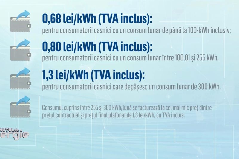 Consumul cuprins între 255 și 300 kWh/lună se facturează la cel mai mic preț dintre prețul contractual și prețul final plafonat de 1,3 lei/kWh, cu TVA inclus.