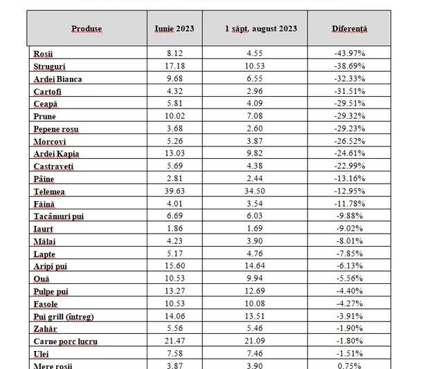 Prețurile medii ale alimentelor de bază vizate de ordonanța privind plafonarea adaosurilor comerciale au scăzut cu până la 43%, în prima săptămână din luna august comparativ cu luna iunie în marile reţele comerciale, conform datelor analizate de Consiliul Concurenţei. Cel mai mult s-au ieftinit roşiile, strugurii, ardeii, cartofii şi ceapa.